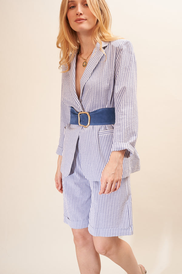 Blazer coupe droite fluide  Existe en taille 1 et 2  100% coton Fabrication Française  Ceinture en cuir disponible en boutiques