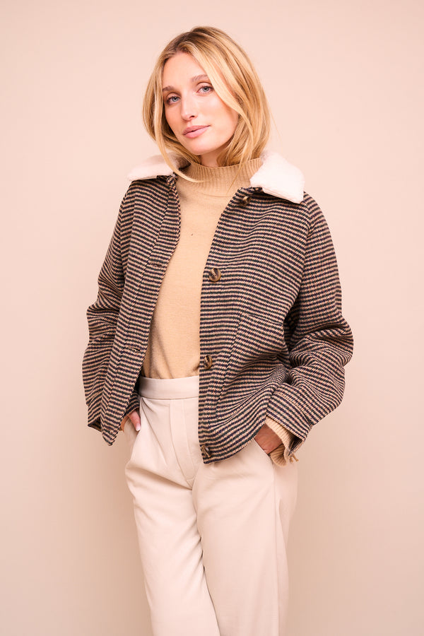 Manteau court, col revers fausse fourrure Manteau avec fermeture frontale à boutons Manches longues, poches latérales plaquées Tailles S, M et L 10% laine, 90% polyester
