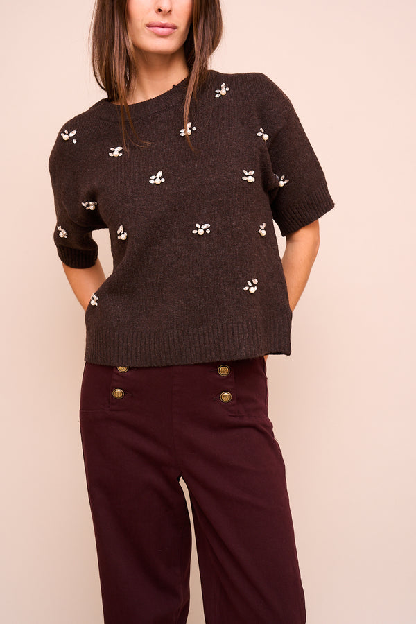 Pull col rond et manches courtes  Pull orné de strass Pull élégant et sophistiqué  Taille S/M et M/L 32 % polyester, 74% acryliques, 4% élasthanne